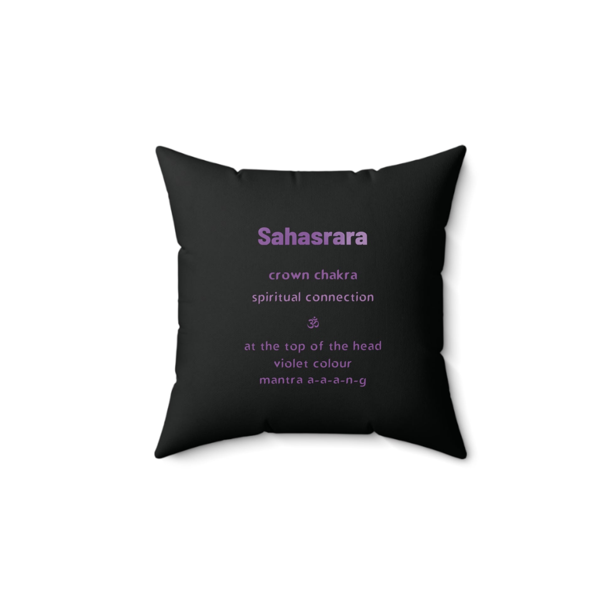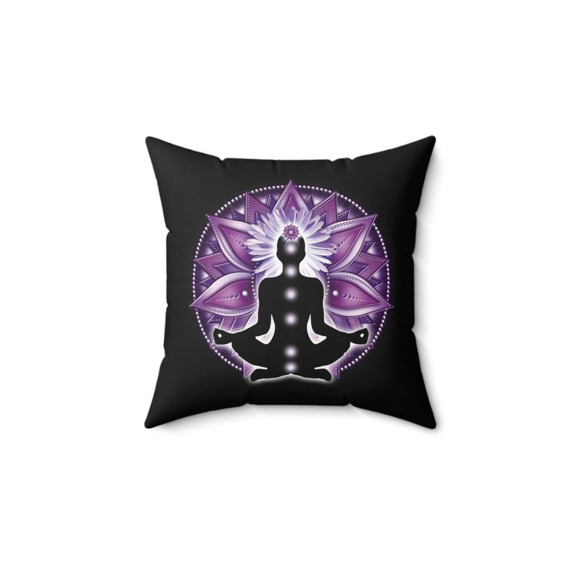 The front features a beautiful, meditative silhouette encircled by a vibrant lotus flower, symbolizing the awakening of the Sahasrara or Crown Chakra. The back offers insights into the chakra, including its location, mantra, and color, making it a meaningful addition to any enlightened home. Perfect for meditation spaces, living rooms, or sacred corners, this pillow not only enhances your decor but also supports your journey toward balance and inner peace.